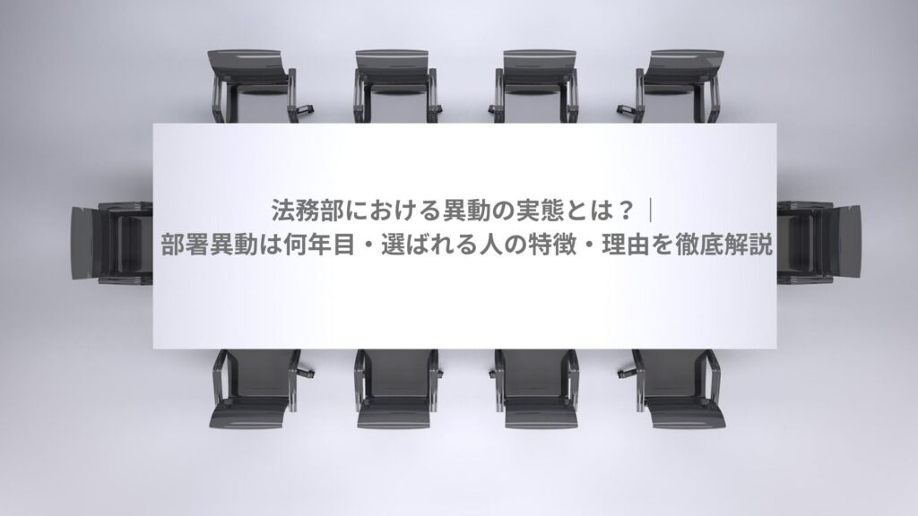 画像出典:筆者 法務を志望する転職活動において、「適性検査で落ちるのではないか」と不安を抱える方は少なくありません。 実際に法務部門は専門性・誠実性・論理的思... 法務実務法務部における異動の実態とは?|部署異動は何年目・選ばれる人の特徴・理由を徹底解説